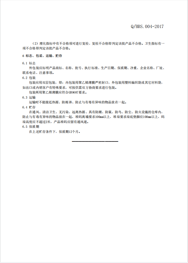 主要质量指标要求有:粒度、水分、容重、霉菌数量、酵母菌数量、沙门氏菌、黄曲霉素、农药残留等指标参考企业标准Q/BBS.004-2017。